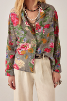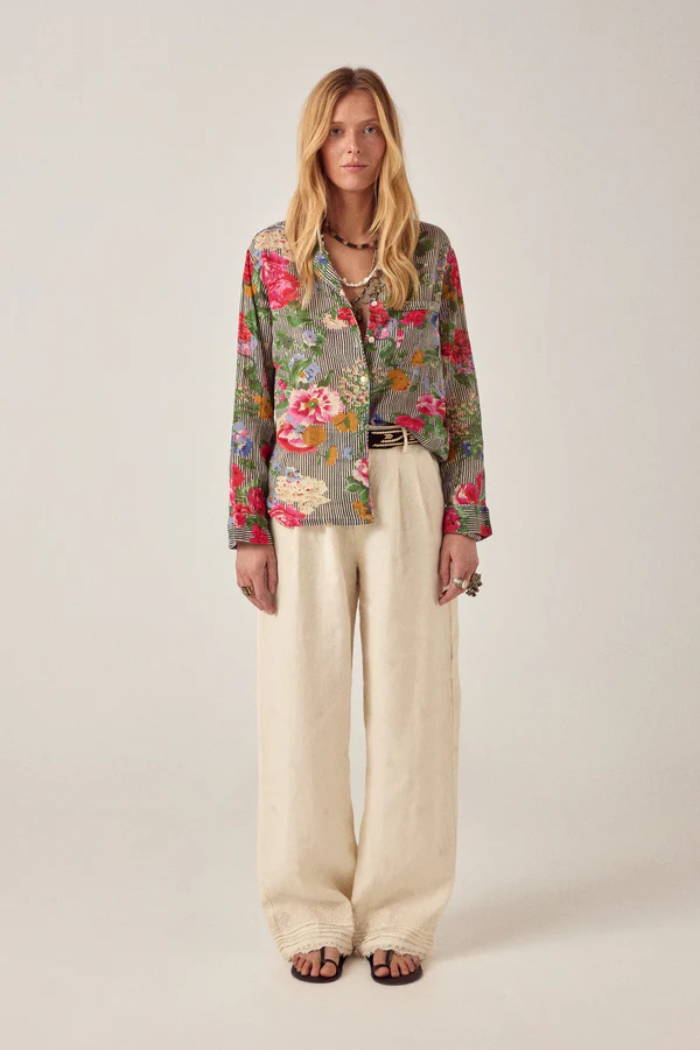 Relaxed shirt in cotton with fine stripe and floral print. Classic collar, button-down front, chest pocket, long sleeves with soft cuffs. Inspired by pyjama silhouettes. Fine stripes act as backdrop, florals emerge naturally across the fabric.
