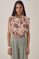 Sleeveless Blouse with stand collar, button front, and vintage-style buttons. Soft pleating at the shoulders, boxy silhouette. Cropped length hits at the natural waist. Same paisley print—cream base with burgundy, teal, mustard, terracotta motifs.