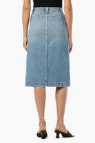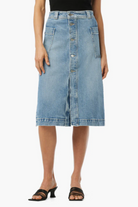 The Pheobe Patch Pocket Midi Skirt debuts for Spring in a light shade finished with local wear patterns. The button up skirt has a high rise and angled patch pockets over the side seams. As part of our Earth Conscious collection, the So Special wash was created using environmentally-friendly practices to reduce water usage and waste output.