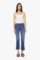 Ready, set, go. Mid-rise jeans with a flared leg, zip fly and a 29.75-inch inseam with a clean hem. Made from a blend of recycled stretch denim, Start Your Engines is a dark blue with whiskering and fading at the knees.