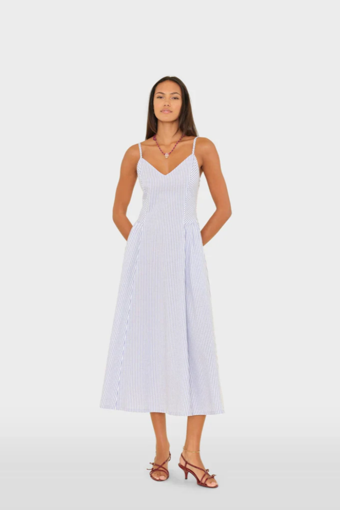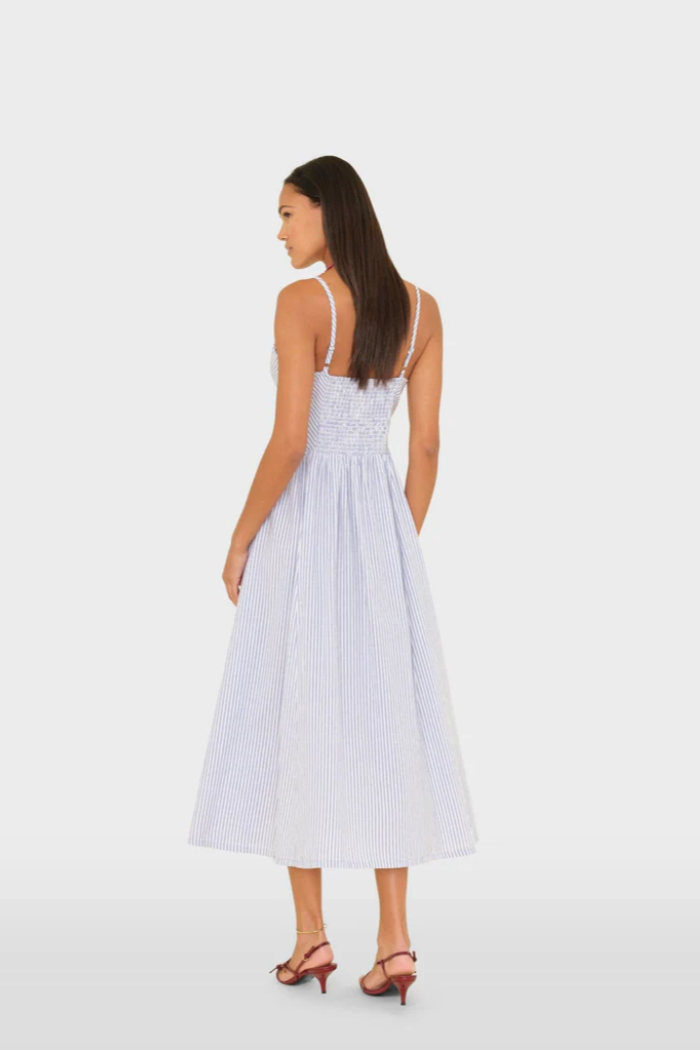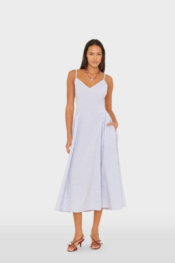 Striped Delight. Bardot is new this season in our lightweight cotton stripe. This femme midi dress features a sweetheart neck, adjustable straps, dropped waist, side seam pockets, and a smocked back.