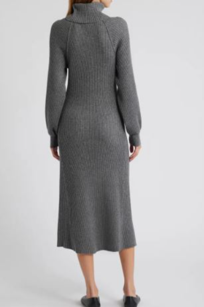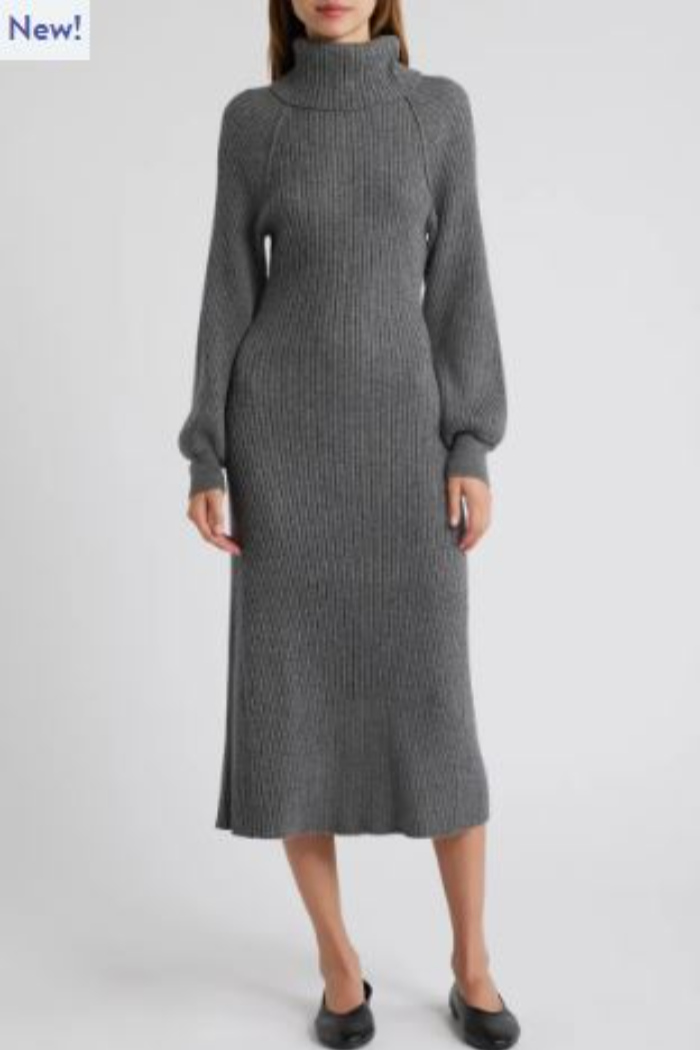 Hit refresh on sweater dress season with a wool-forward option shaped with a slouchy turtleneck and fixed with gently billowed sleeves.