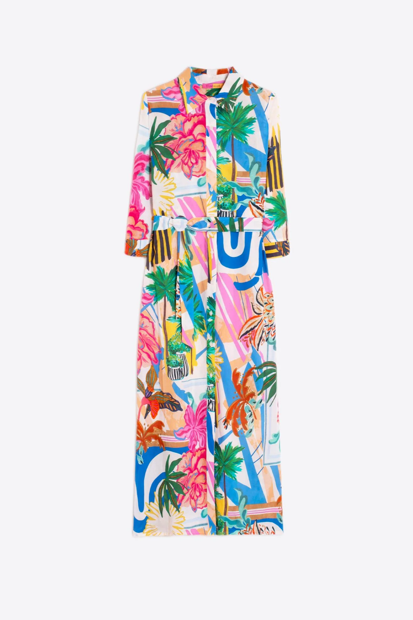 Long shirt dress with a multicolored print inspired by summer. Classic shirt collar, button front closure, and 3/4 sleeves. Includes matching belt.