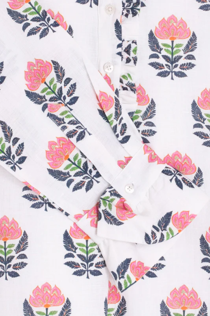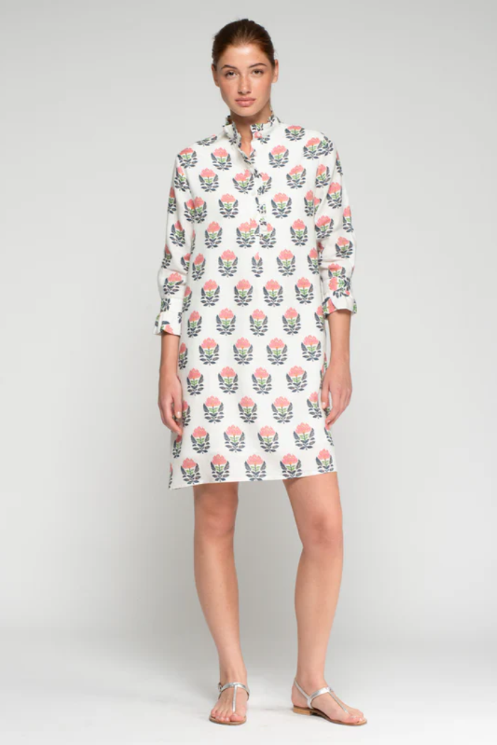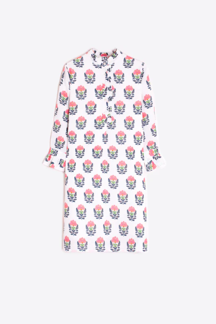 Straight-cut dress with a repeating floral print in shades of pink, green, and navy. Three-quarter sleeves with ruffled cuffs and a high neck with a ruffle.