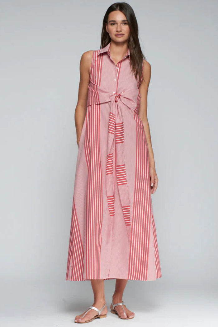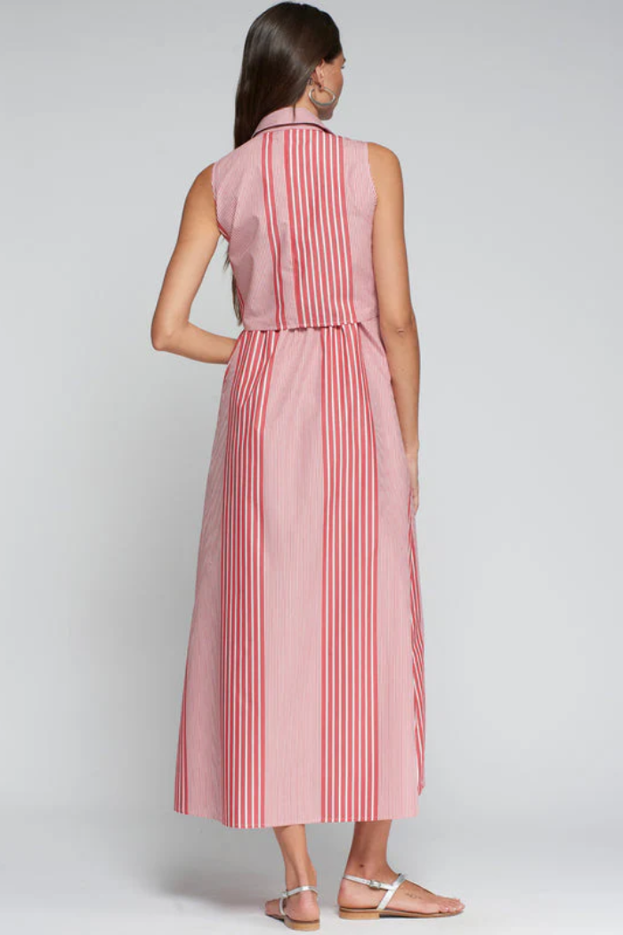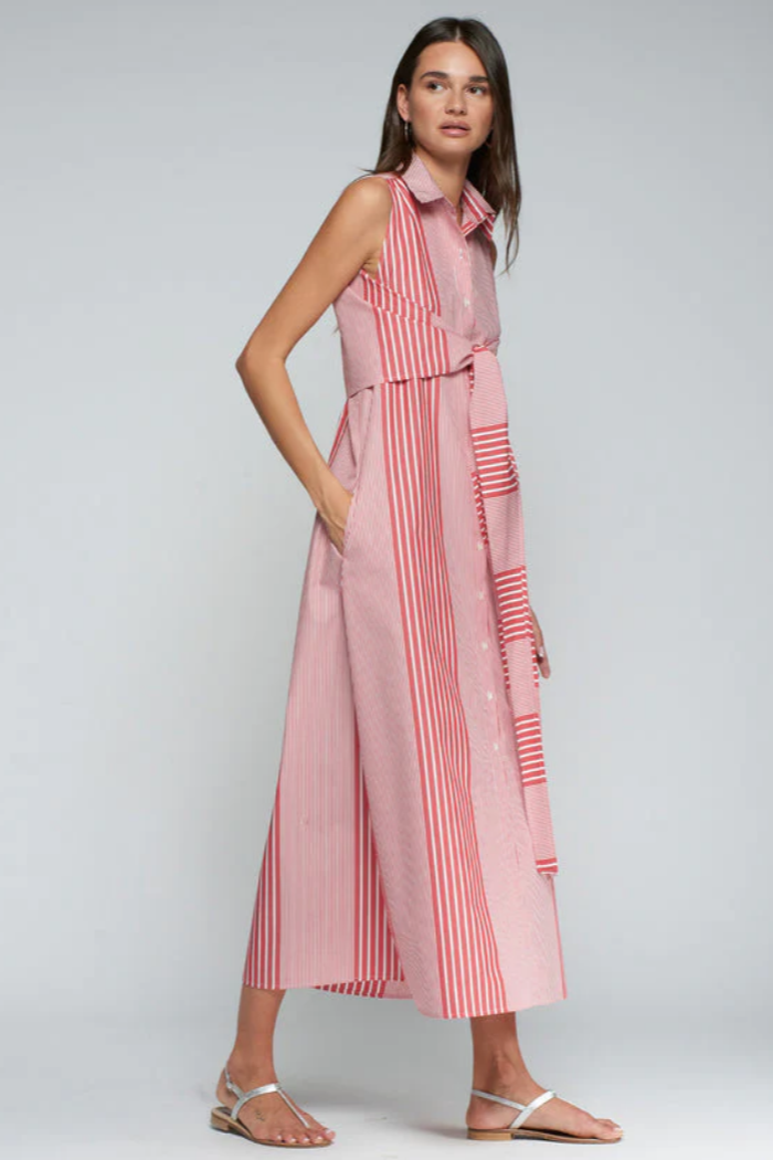 Long, straight-cut dress with shirt design and vertical stripe print in different thicknesses and directions, combined in red and white tones.