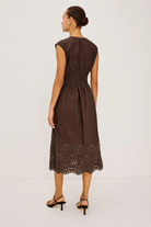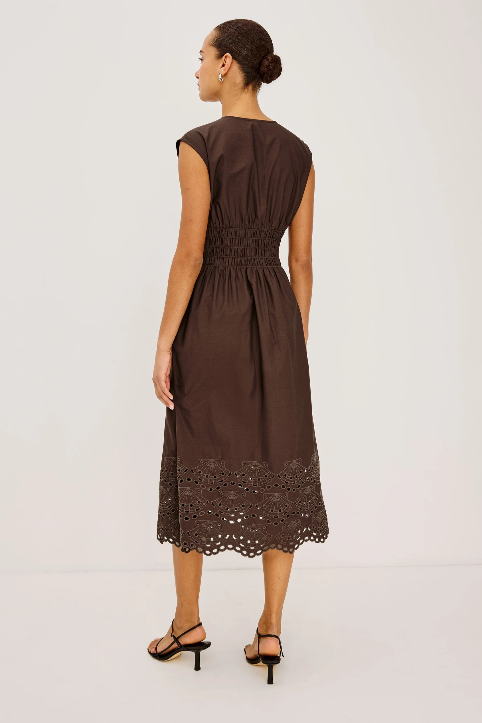 The Roxanne is a lightweight cotton midi dress with shirred shoulders, a plunging V-neckline, a smocked waist, and delicate seashell embroidery along the hem.