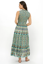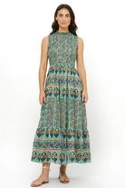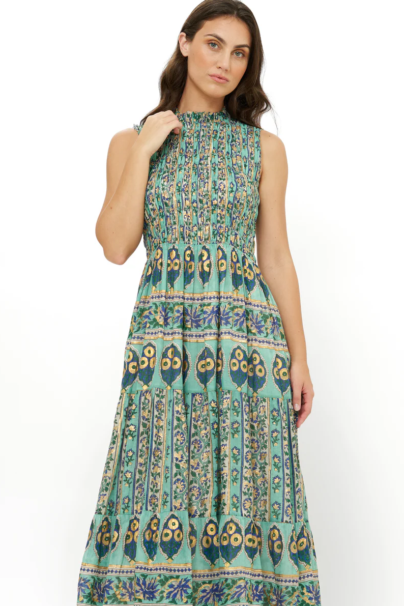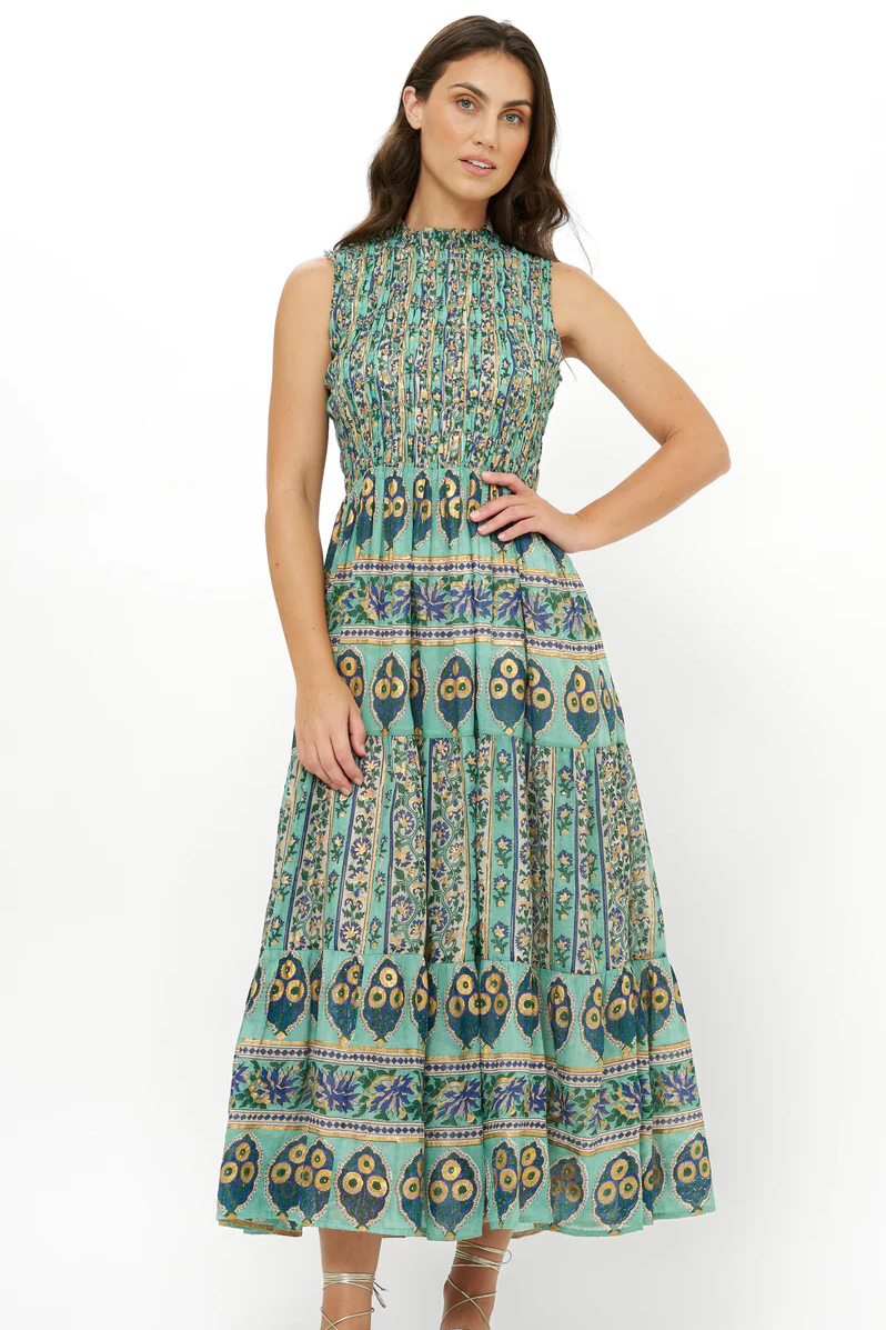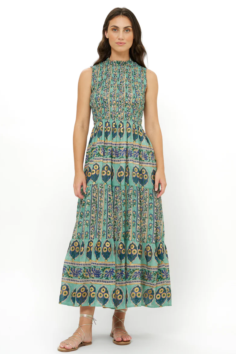 Crafted from lightweight cotton voile, this silhouette balances a delicate smocked bodice with a fluid, tiered skirt for effortless movement. The vibrant teal palette and intricate floral patterns create a versatile, resort-forward look perfect for transitioning from a morning of discovery to an elegant sunset retreat.