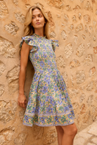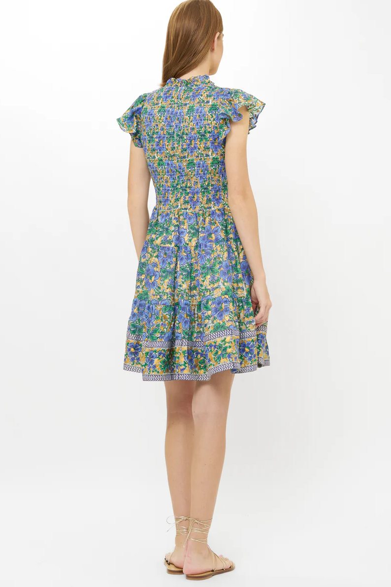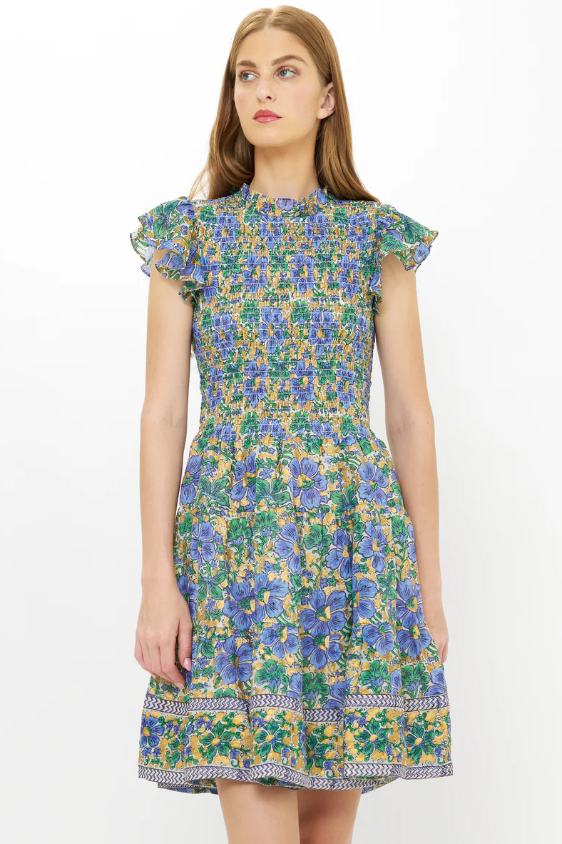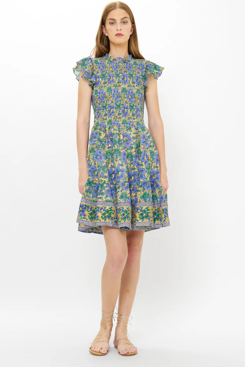 Tailored from lightweight cotton voile, this silhouette balances a structured smocked bodice with playful pleated ruffles for a look of effortless, feminine charm. The intricate botanical motifs and shimmering gold accents create a versatile, spring-ready vision perfect for transitioning from a ladies lunch to an evening under the stars.