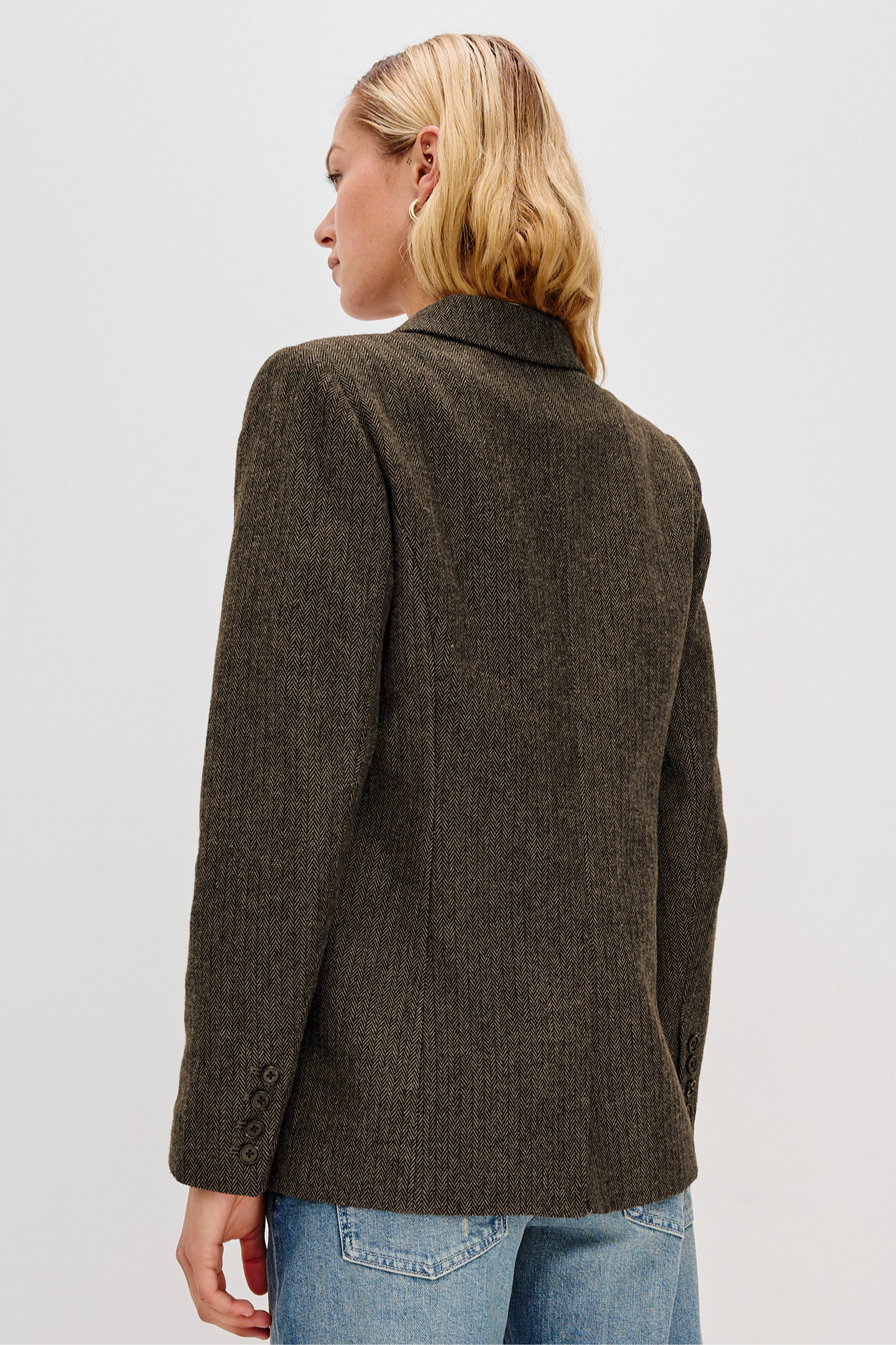 The Jac Blazer, made from luxe herringbone suiting, is classically tailored for a perfect fit along with faux horn buttons, notched lapels, and functional flap pockets.