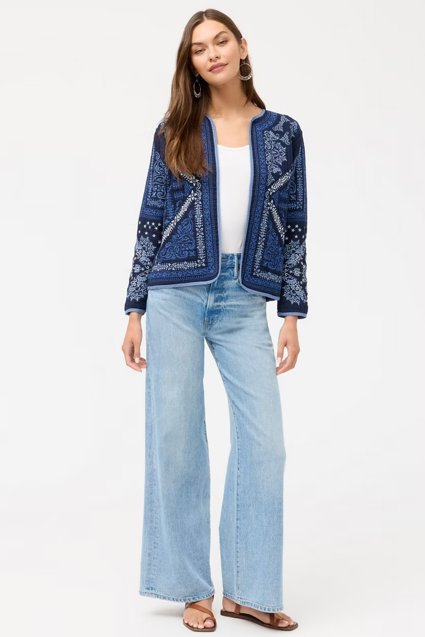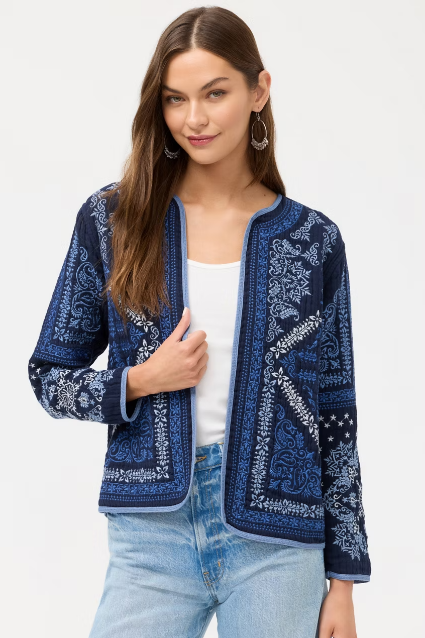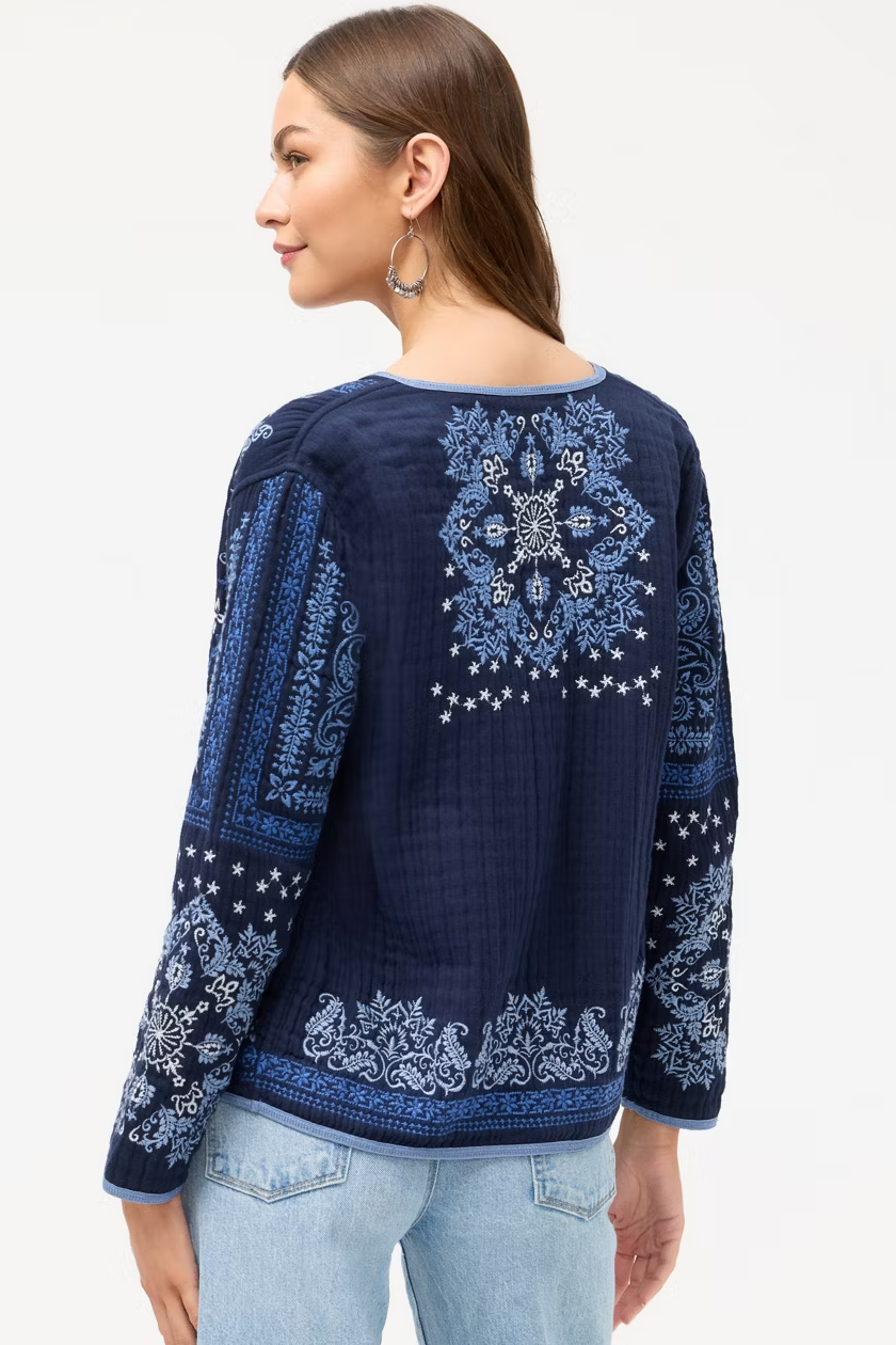 Intricately adorned with rich tone-on-tone embroidered detailing, the Lorem Gauze Jacket is crafted from breathable 100% cotton. Designed with an open front and long sleeves, this beautifully ornate jacket is finished with a uniquely cured hemline. Layer over a crisp white linen top and pair with light wash denim for a polished casual look.