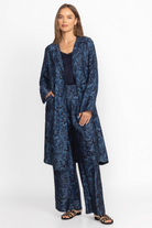 Adorned and eye-catching pattern in vibrant shades of blue, the Johnny Was Duster Coat adds a hint of drama to your look. Featuring a button-front closure with fabric covered buttons this full-length duster is finished with pockets at the sides. Layer over a classic black dress and pair with strappy sandals for an unforgettable evening look.