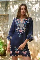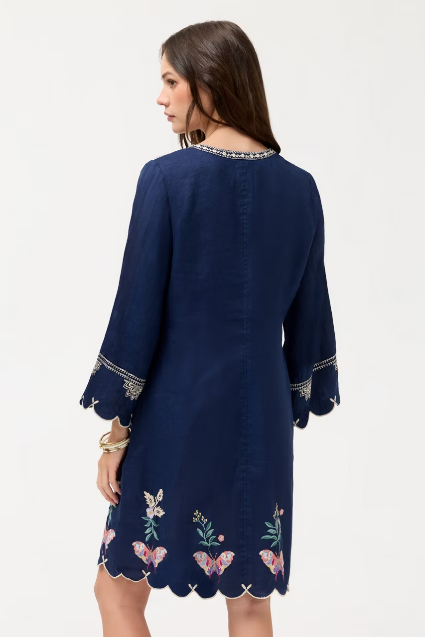 Enhanced with an intricate floral embroidery, the Linen Scallop Dress is an elegant take on a comfort-focused style. Crafted from breathable 100% linen, this unique dress features a split V-neckline, 3/4 sleeves and a shift silhouette finished with delicate scalloped edging. Pair with colorful flats and a clutch for an elegant lunch date ensemble.
