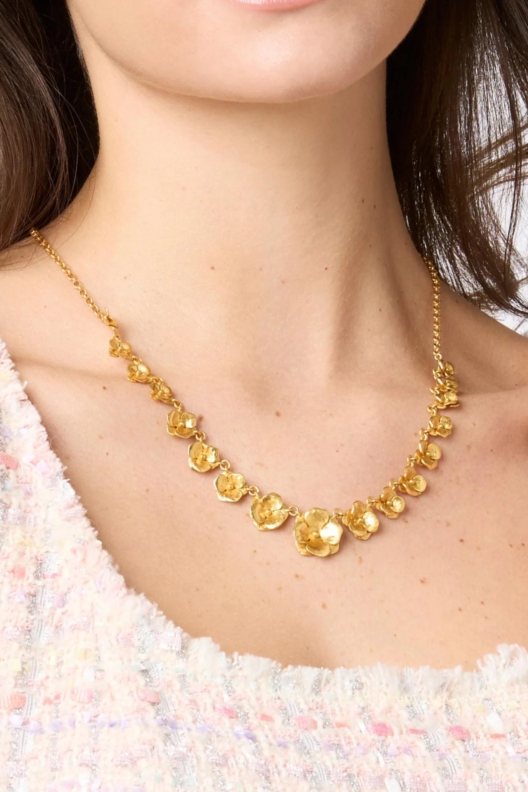 The Bloom Demi Necklace is a floral statement necklace featuring linked blossom motifs in a warm gold-tone finish. Its demi-length silhouette sits close to the collar for a polished, eye-catching look. This piece is by Julie Vos and pairs well with both elevated daytime outfits and evening attire.