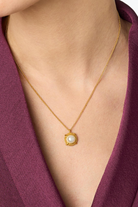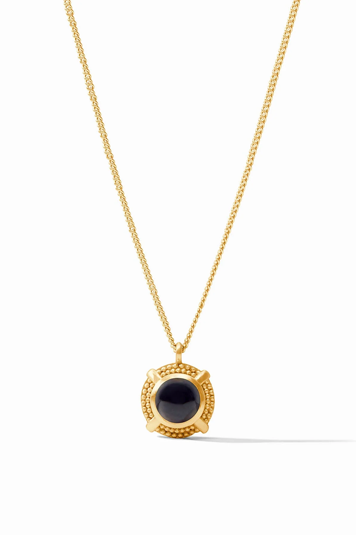 A polished round gemstone in a golden beaded setting with an X motif dangles from a delicate curb chain.