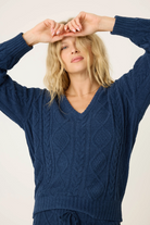 Get cozy in this women's long sleeve v-neck sweater, featuring a classic cable knit design. Perfect for lounging around the house or layering for a chilly day out, this soft chenille cable knit sweater offers warmth and comfort. Pair it with your favorite lounge pants for a complete look that’s perfect for relaxed weekends.