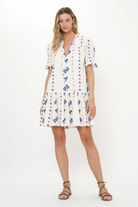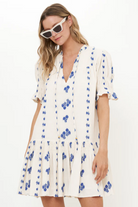Embroidered florals add delicate design and detailing to our soft Woven Cotton fabric. Smocked short puff sleeves and ruffle hemline make this dress a fun and flirty wear.