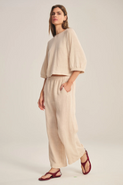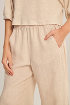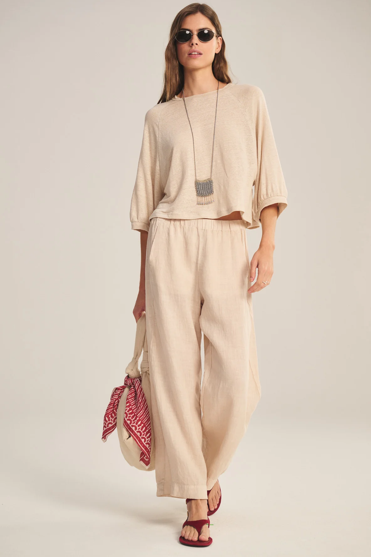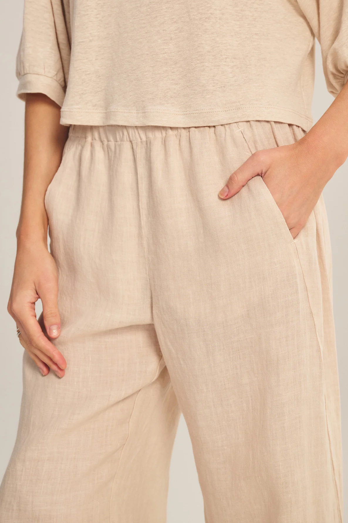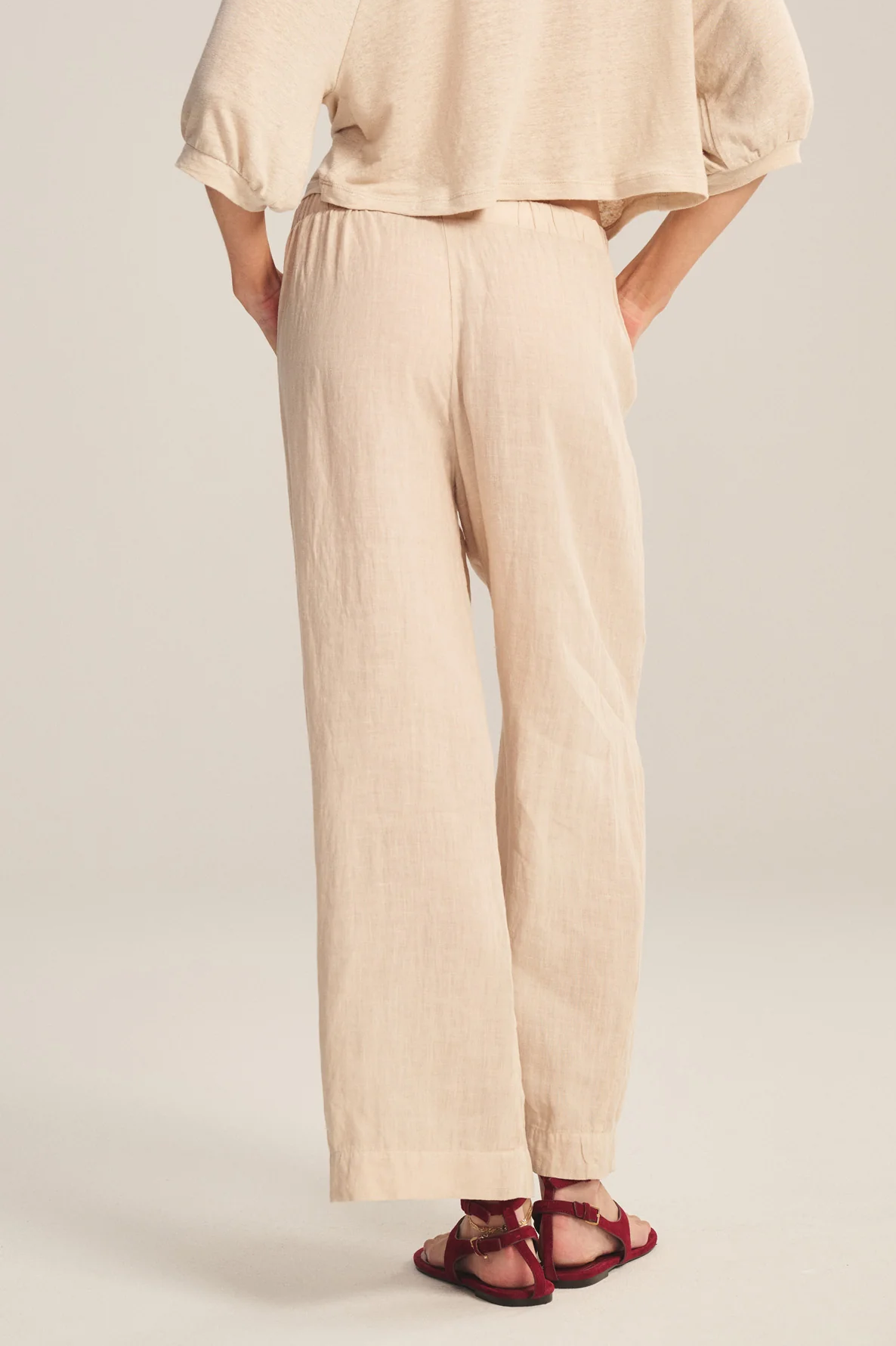 The perfect warm weather pant. Crafted from lightweight woven linen, the Lola features a soft elastic waistband, relaxed straight leg, subtle ankle crop, and side seam pockets for everyday ease. This pull-on silhouette offers breathable comfort and a naturally flattering drape. It pairs seamlessly with soft knits and structured shirting, making it a dependable choice for travel and daily wear.