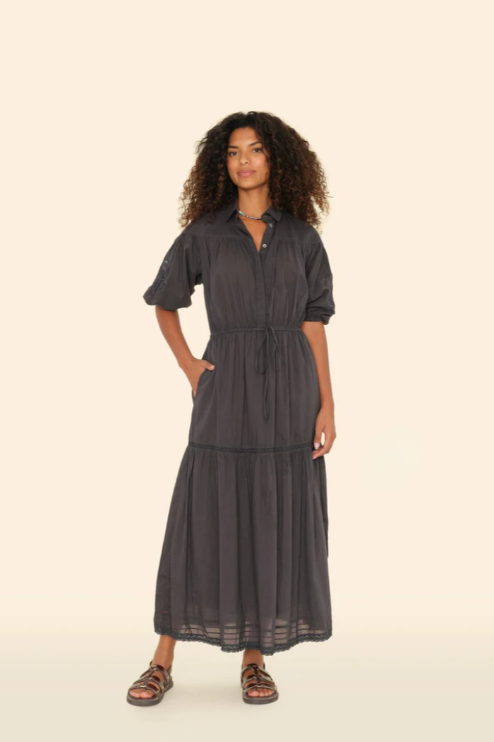 Picture Perfect. Kaya is new this season in our superfine cotton voile with a soft hand. Kaya is a fully lined midi dress with a partial button-front, elbow puff sleeves with floral broderie anglaise, an elasticized drawstring waist, side seam pockets, and ladder trim throughout.