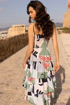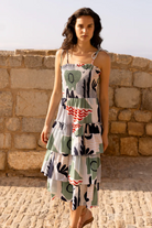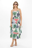 A dress that deserves to be seen! Serene scenes of the French Riviera compliment the smocking that comfortably hugs your bodice. The tiered ruffle skirt adds fun movement and volume.
