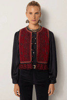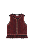 Maison Hotel’s Casilda vest in Château Bordeaux is the kind of piece that instantly adds depth to an outfit. Made from soft cotton gauze, it comes in a rich claret red with delicate embroidered piping and a gently ruffled hem. The easy, sleeveless cut makes it perfect for layering over dresses, shirts, or knits, bringing a touch of artisanal detail without feeling fussy.
