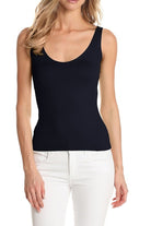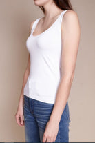 Super soft low back next to skin layering tank top in white. Features scoop neck, low scoop back, fixed shoulder straps, and straight hem. Model is 5' 8" and is wearing a size S. Can wear low in front or the back.
