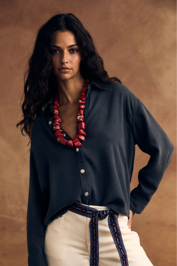 Forever Denim. Gia is made in our drapey, ultra-soft lyocell denim. This relaxed button-front shirt features metal snap buttons, spread collar, drop shoulders, and a back yoke.