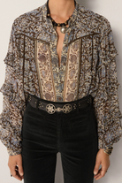 Designed with long sleeves that finish in loose ruffles, and additional ruffle panels along the arms that create rhythm as you move. The collar is cut to be worn open or fastened, allowing versatility in its mood.