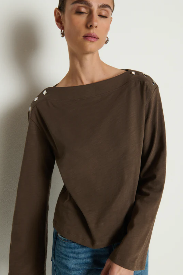 The Rochelle Boatneck Tee brings a refined, dress-up feel while still staying cool and approachable. Boxy, soft, and easy to wear, it’s finished with bell sleeves, a clean boat neckline, and subtle silver snaps for just the right amount of character.