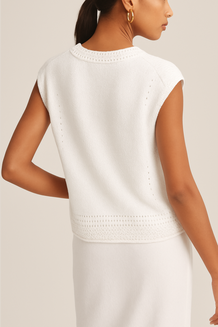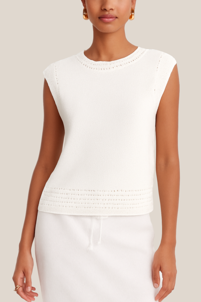 A versatile white knit crew neck with cap sleevesthe perfect layering piece for effortless everyday style. Soft, breathable fabric moves with you, while the classic silhouette pairs seamlessly with everything from denim to tailored trousers. Timeless comfort meets contemporary design.
