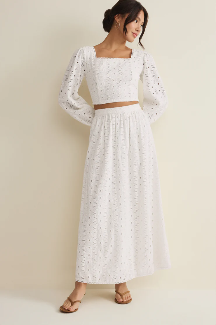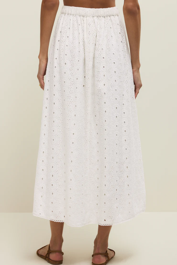 The perfect skirt does exist. This 100% cotton midi skirt features an elastic waistband, eyelet detail, and full lining.