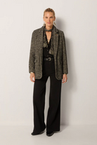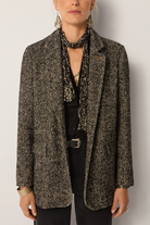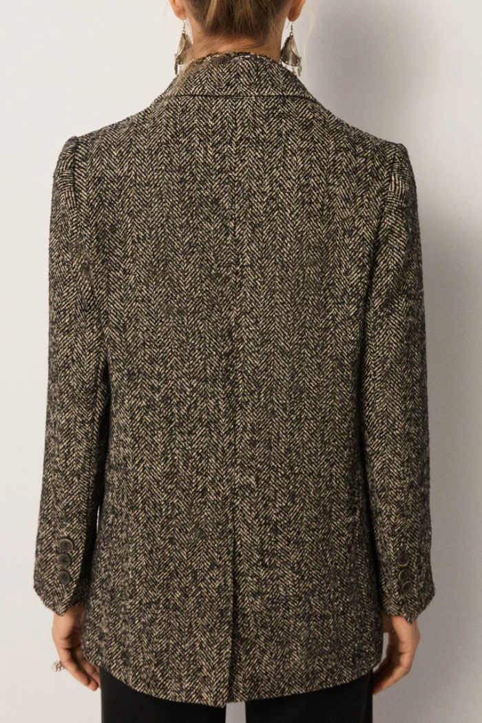Sharp lapels and front pockets highlight its menswear roots, softened by the relaxed shape.