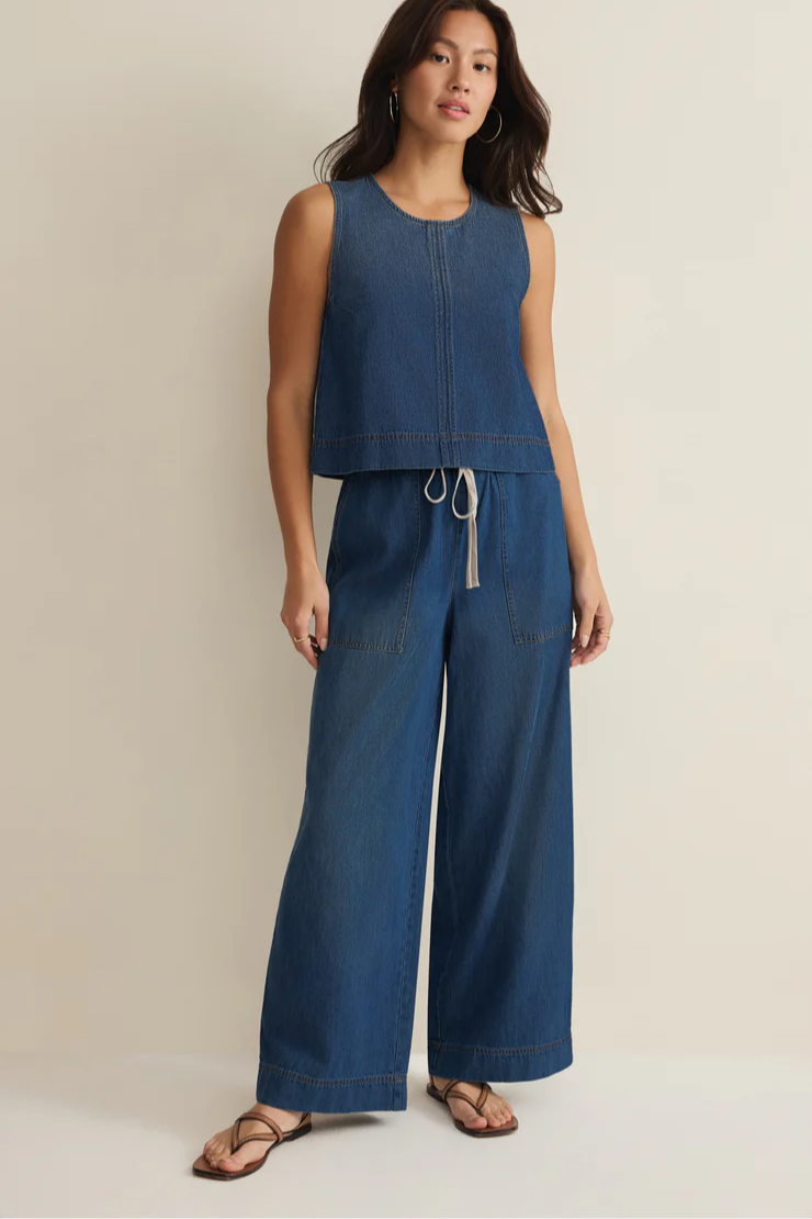 Count us in for ultra soft denim made of 100% cotton. These wide leg pants feature patch pockets, drawcord waistband and midweight feel to them. Dress it up or down with its matching top or a simple tank.