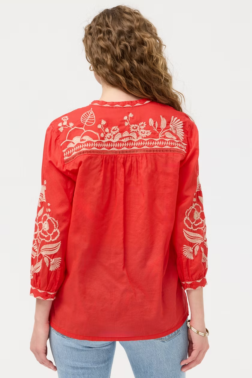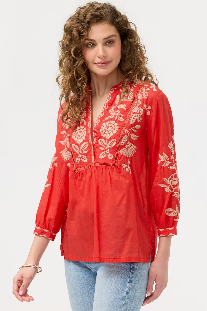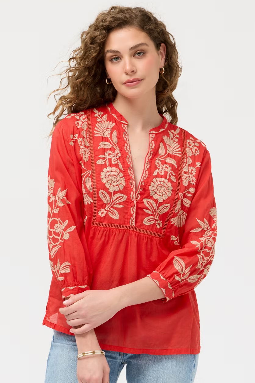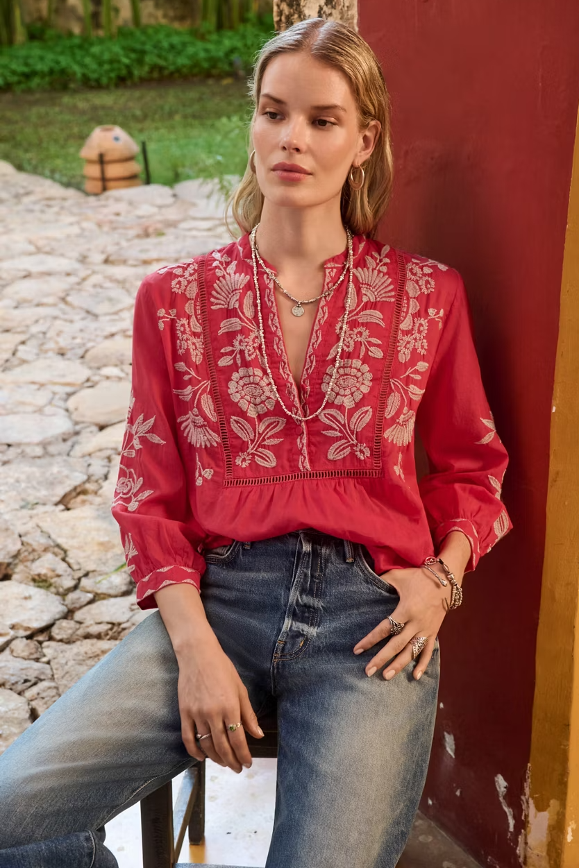 Crafted from rich 100% cotton, the Lucinda Henley Yoke Blouse is accented with intricate embroidery at the bodice and sleeves. Designed with a Henley neckline and gently puffed 3/4 sleeves, this embroidered top is finished with a distinctive ladder trim. Pair with a white denim skirt and western-style boots for a fun night out with friends.