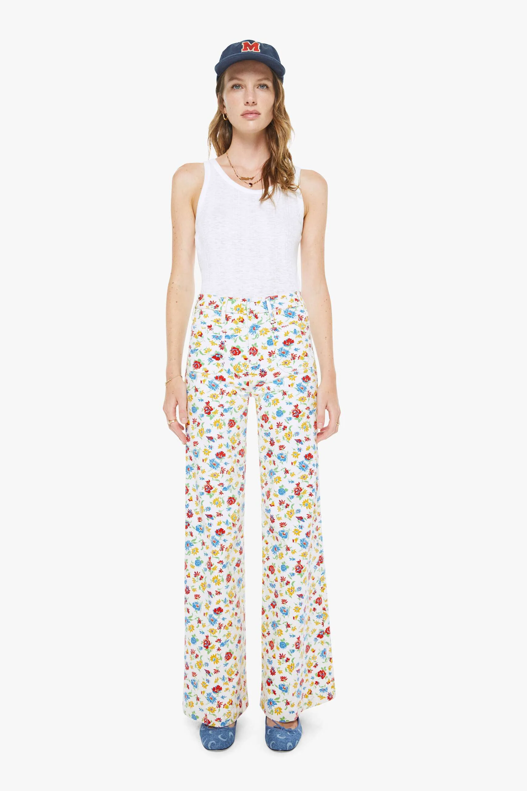 70s-inspired wide leg jeans with a high rise, zip fly, patch pockets, 32-inch inseam and clean hem. Made from stretch denim, Rose Bowl is a bright white with a colorful floral print.