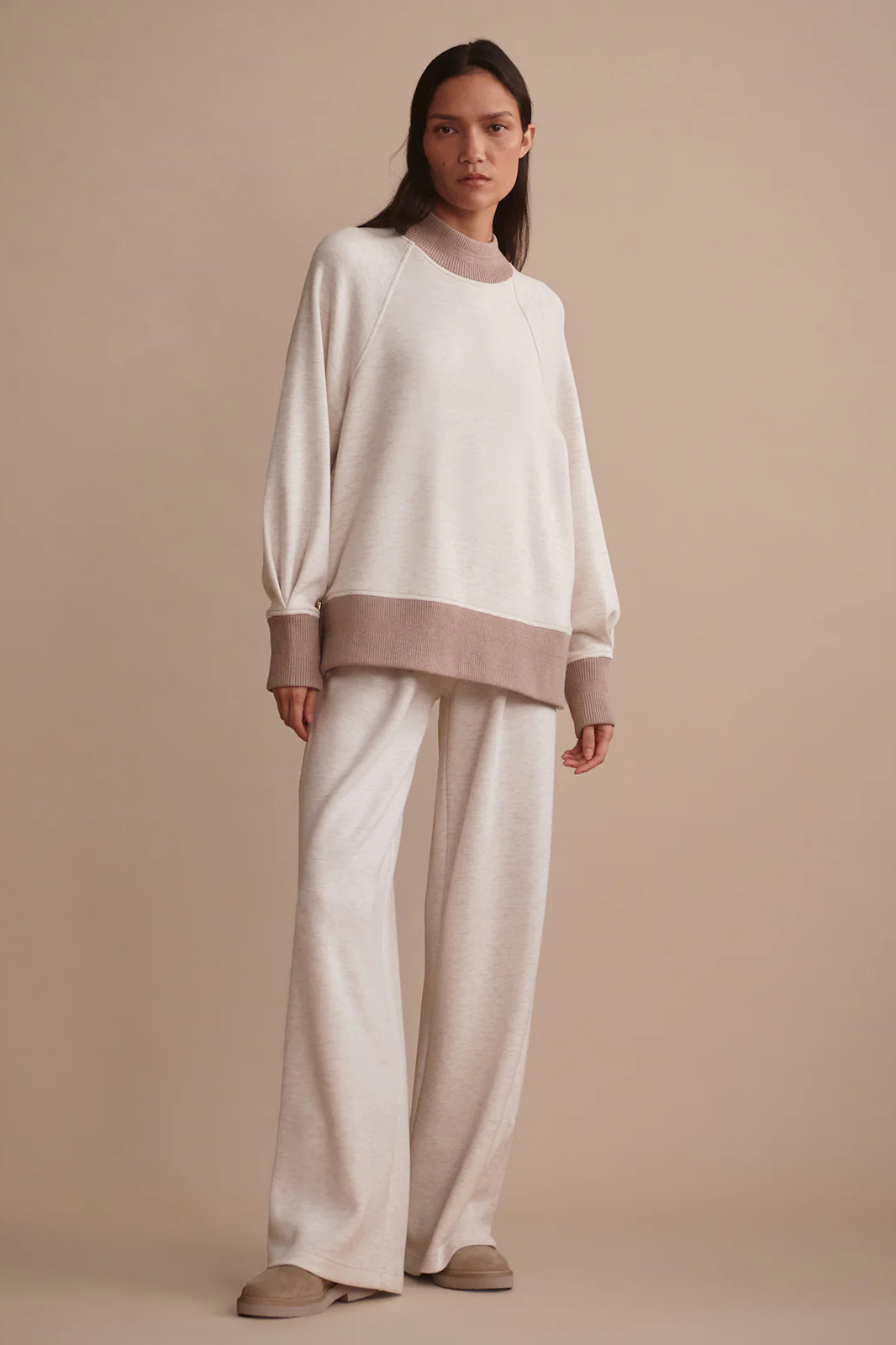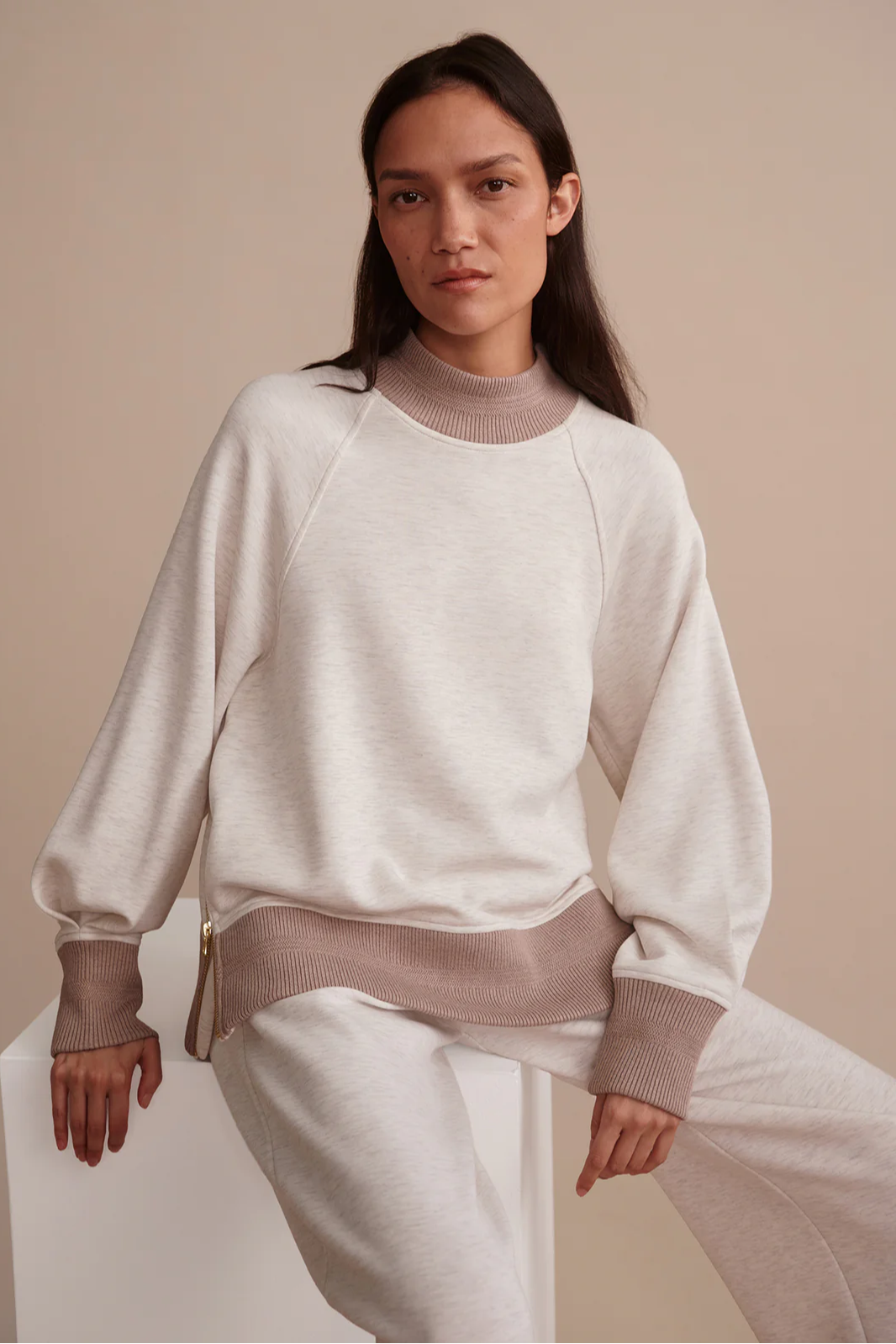An elevated take on your everyday sweat, the Loxley is made from our signature DoubleSoft® fabric for unmatched comfort and style. It is cut to a mid-length and relaxed fit, featuring a mock neck and dropped raglan sleeves. Decorative knitted trims and pleat details at the cuffs set subtle accents.