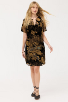 Boldly embellished with a metallic burnout pattern, the Modet Short Dress is adorned with vibrant flora and fauna. Designed with a keyhole front with a button loop closure, this slip-lined shift dress is finished with shorts sleeves and a straight hemline. Pair with metallic heels and stunning gold jewelry for a polished evening look.