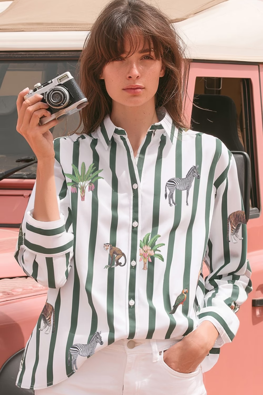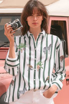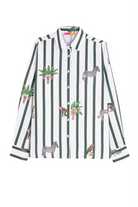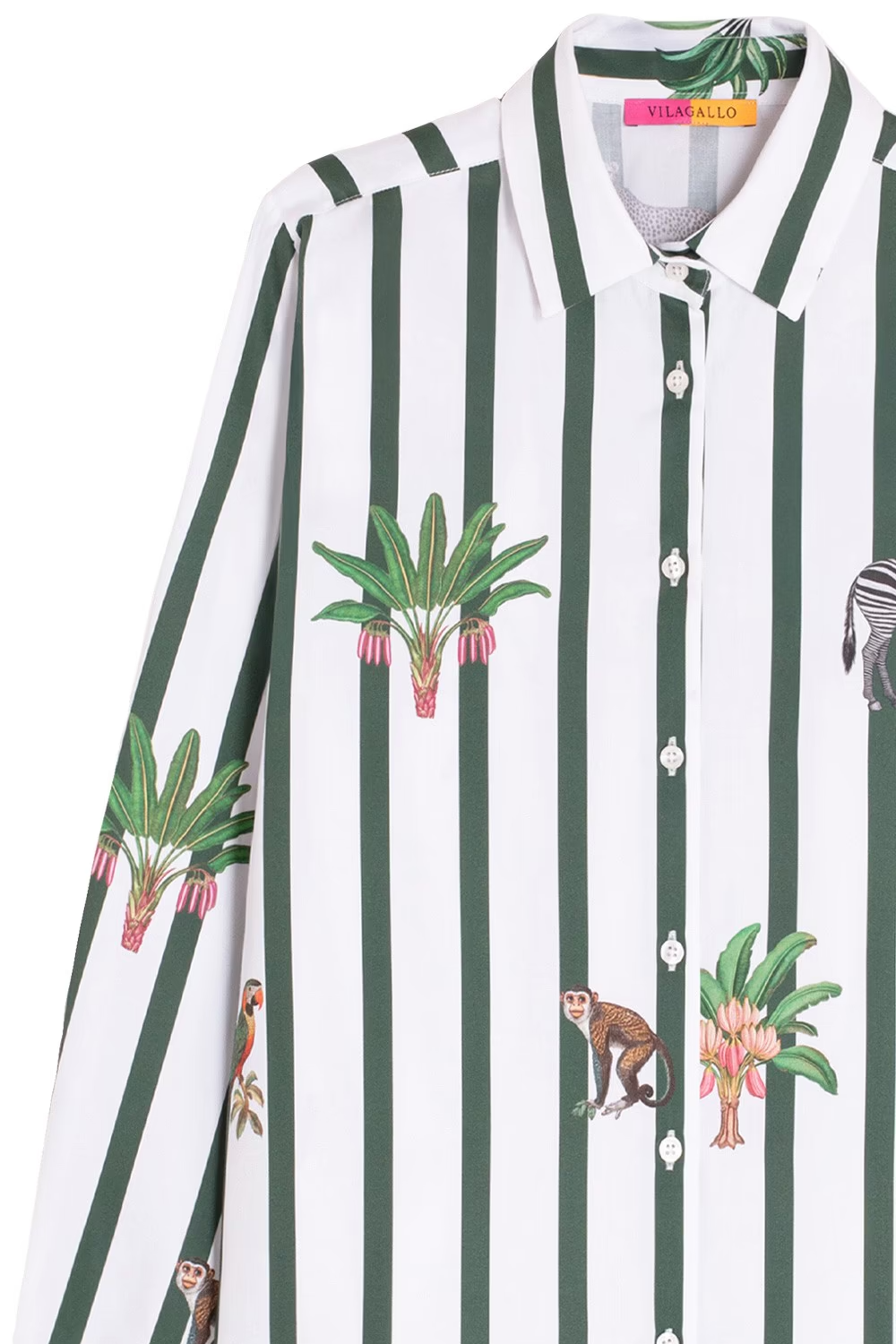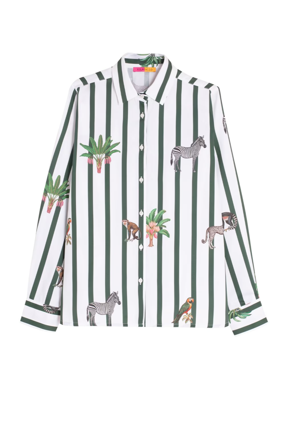 The ladies Vilagallo cotton stripe Jungle shirt pairs crisp vertical stripes with playful jungle motifs in a classic button up silhouette.