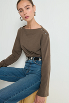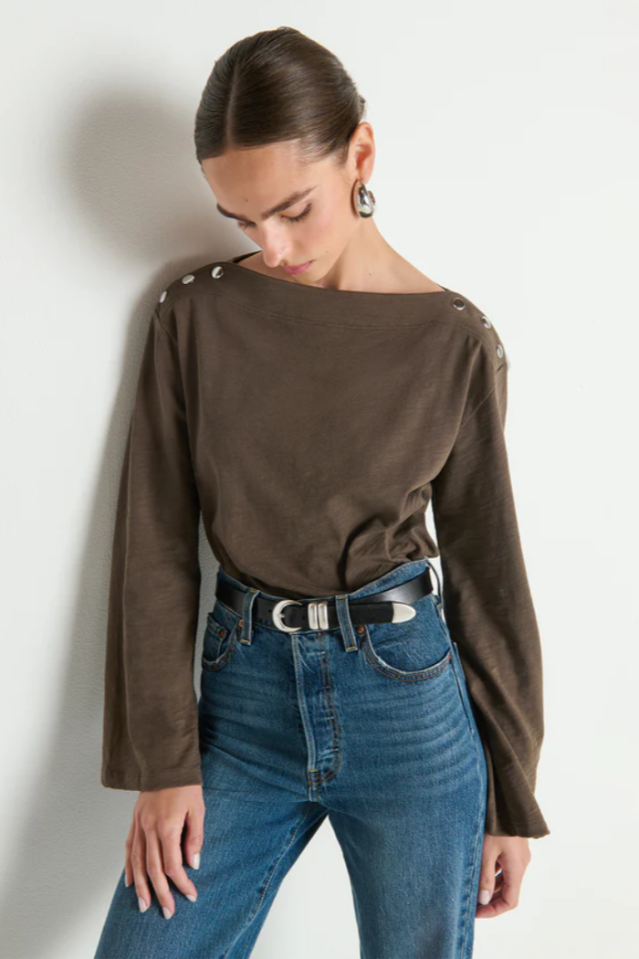 The Rochelle Boatneck Tee brings a refined, dress-up feel while still staying cool and approachable. Boxy, soft, and easy to wear, it’s finished with bell sleeves, a clean boat neckline, and subtle silver snaps for just the right amount of character.