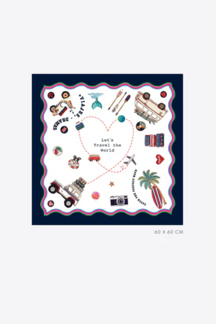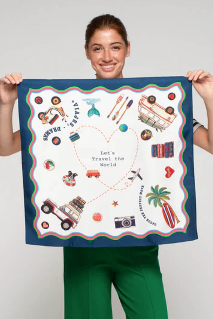 A lightweight square scarf printed with playful travel and surf motifs, perfect for tying around the neck or bag. The Surf Scarf is finished with a contrasting navy border and vibrant illustrations that give it a whimsical, beach-ready feel. Vilagallo designed this piece with a smooth, drapey fabric that layers easily over warm- or cool-weather looks. Wear it as a neckerchief, headscarf, or accessory to elevate casual outfits.