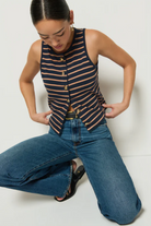 This versatile tank features a crew neckline and functional placket with our signature gold buttons imported from Italy. Do it all the way up for a polished look, or leave it partially open for a perfectly undone vibe. This one comes in Latte Stripe.