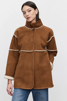 Elevate your outerwear with this versatile reversible jacket by Velvet by Graham & Spencer. One side features eco-friendly faux sherpa, while the other boasts a sleek faux suede. Designed with a relaxed silhouette ideal for layering over sweaters, it includes slash pockets, snap buttons, and a stylish stand-up collar.