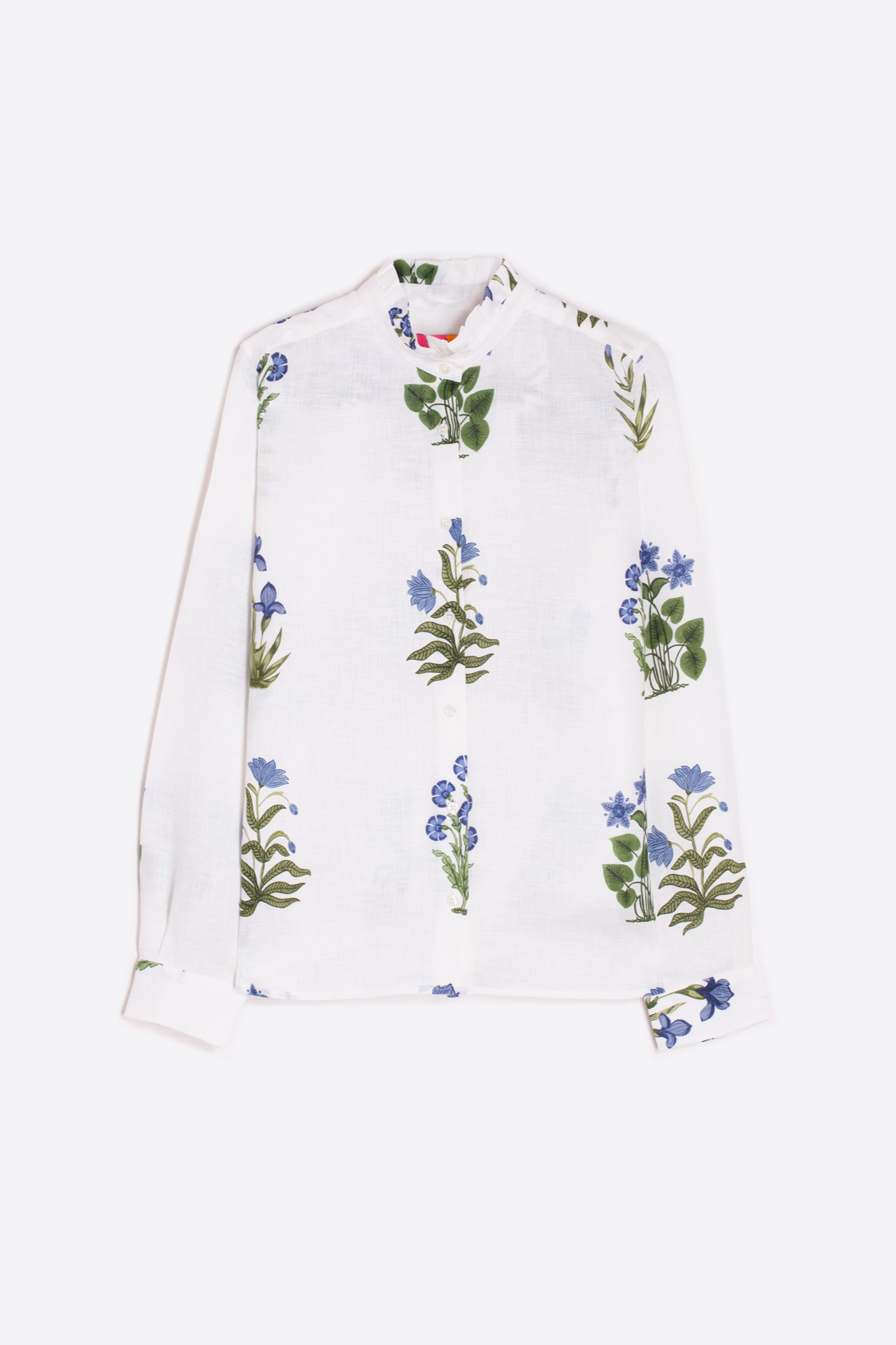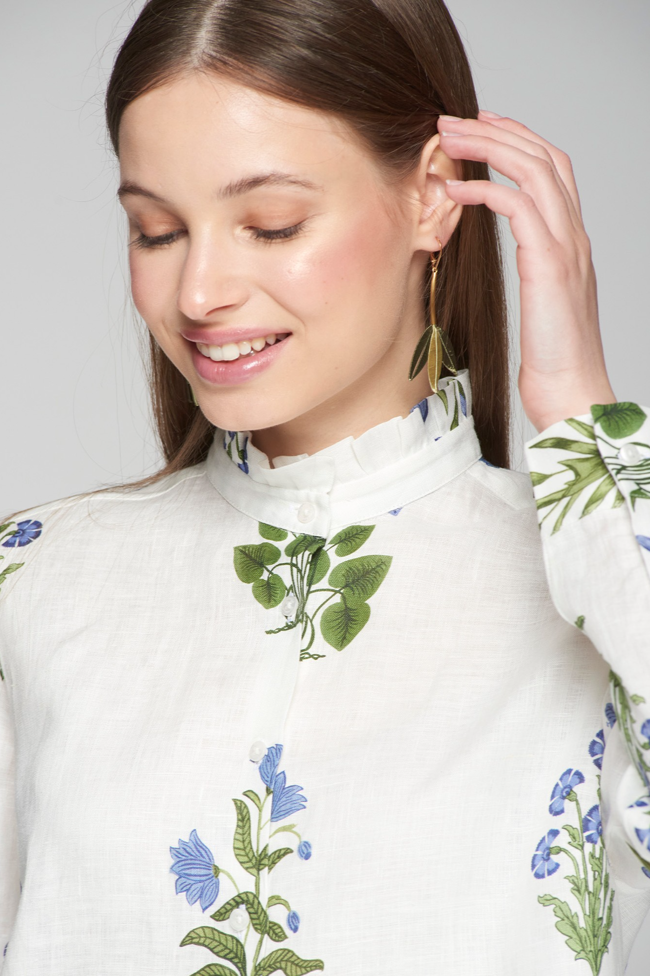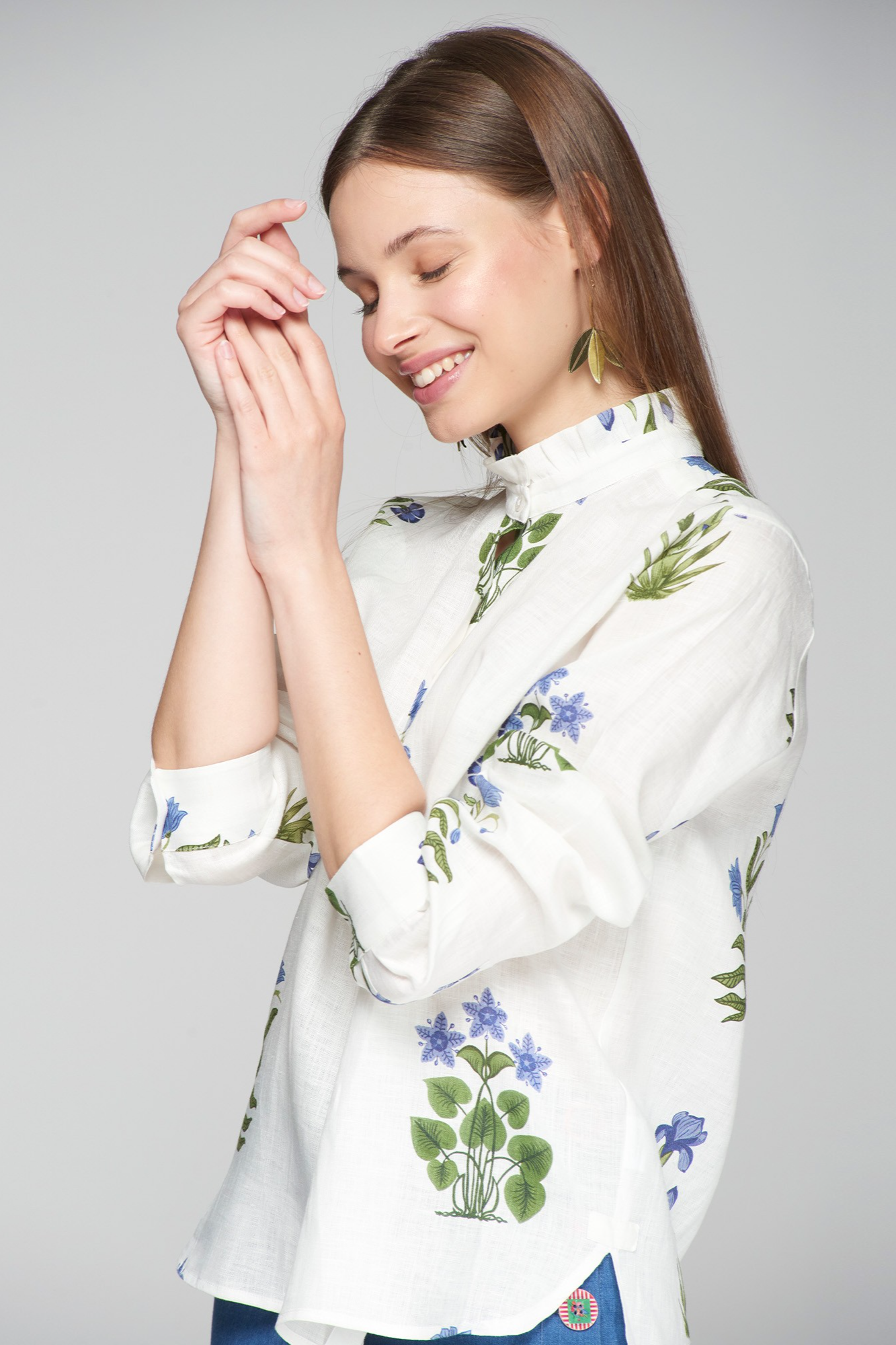 White linen shirt with blue flowers. Ruffle collar. Front fastening with white shirt buttons. Long sleeves with cuffs. 100% linen. The model is 1.75 m tall and wears size 38.