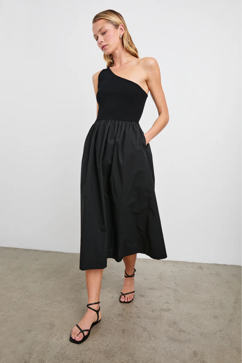The Anita is an elevated midi dress with an asymmetrical stretch bodice and a full poplin skirt for a fit-and-flare silhouette. It's finished with concealed pockets for day-to-night convenience.