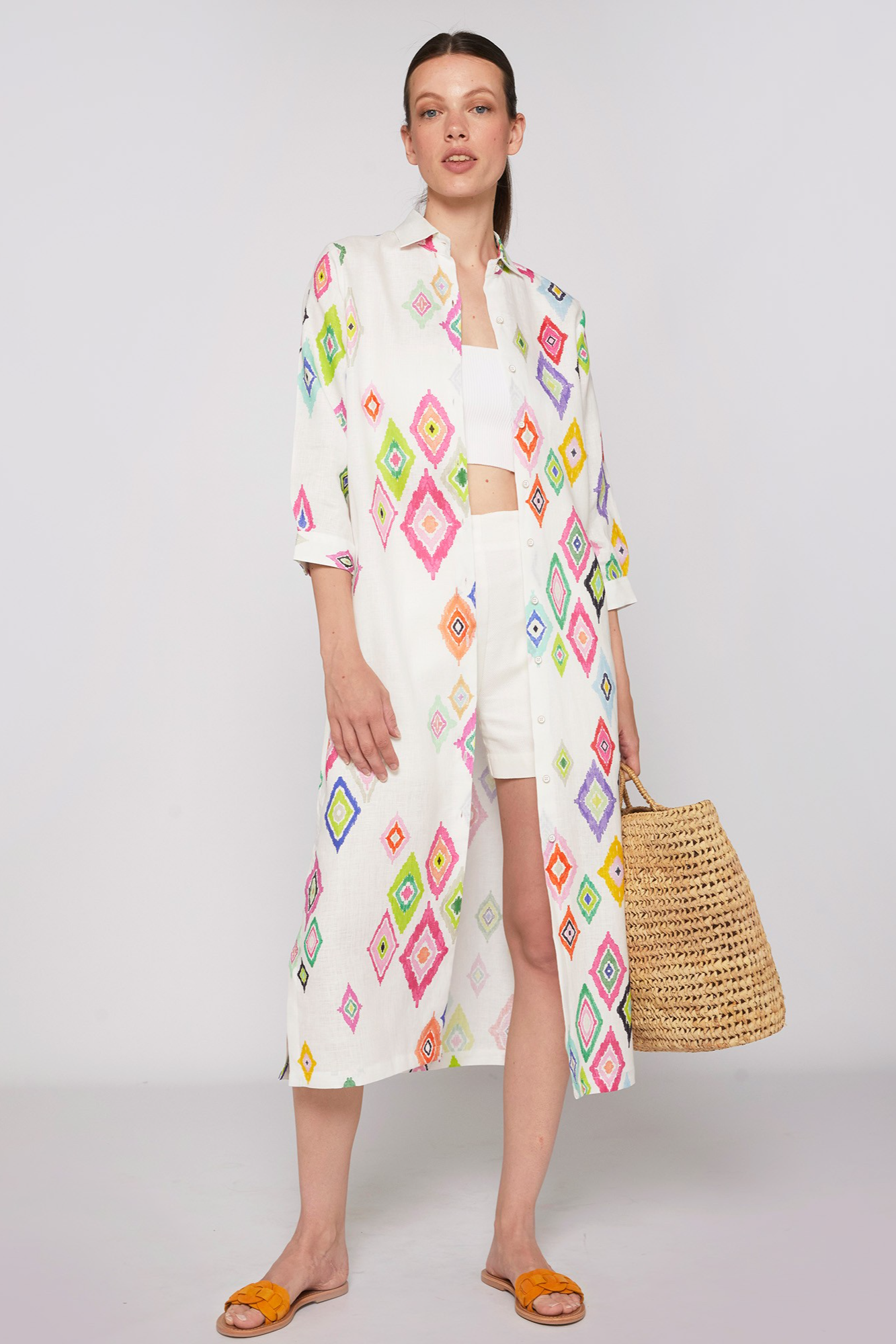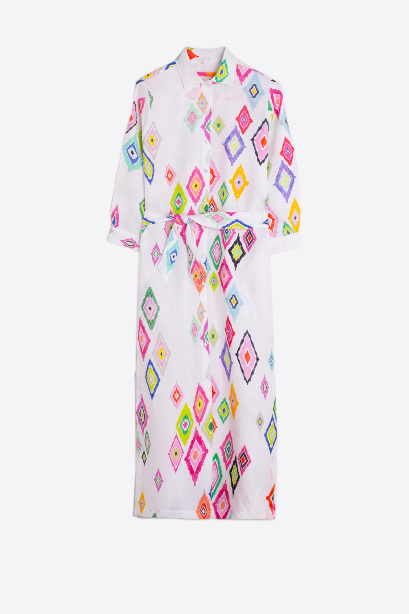 Long linen dress with ikat print in various colours. Shirt collar and cuffs. Removable belt. The model is wearing a size 38.