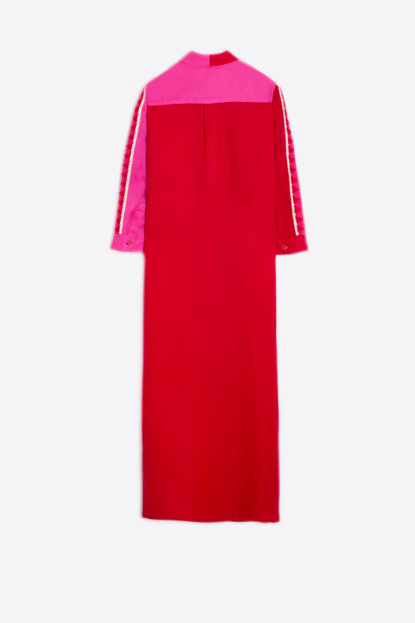 Long linen dress that combines in red and pink. Embroidery detail on the sleeves. Shirt collar and cuffs. Removable belt. The model is wearing a size 38.