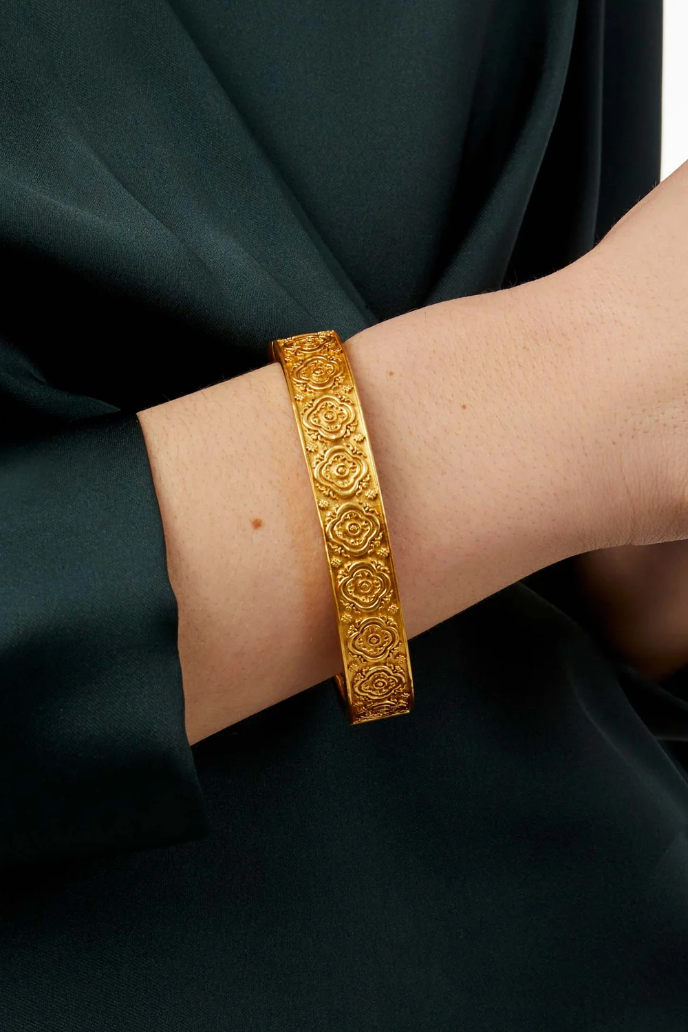 Adorned with an intricate repeating quatrefoil coin motif, this oval-shaped golden bangle is backed with delicate piercework for lightness and luxury.