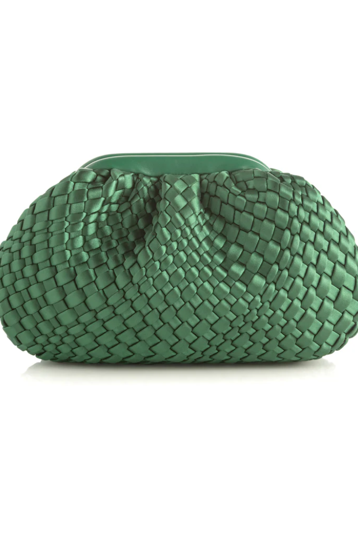 Stand out this season with Shiraleah’s chicest new fall handbag, the Bailey Clutch. This classic clutch silhouette comes in a vibrant green color and is elevated by its woven satin texture with a sleek, magnetic frame top closure. Just under a foot long with a roomy interior, it is the perfect size to carry all of your essentials in hand during a night out.