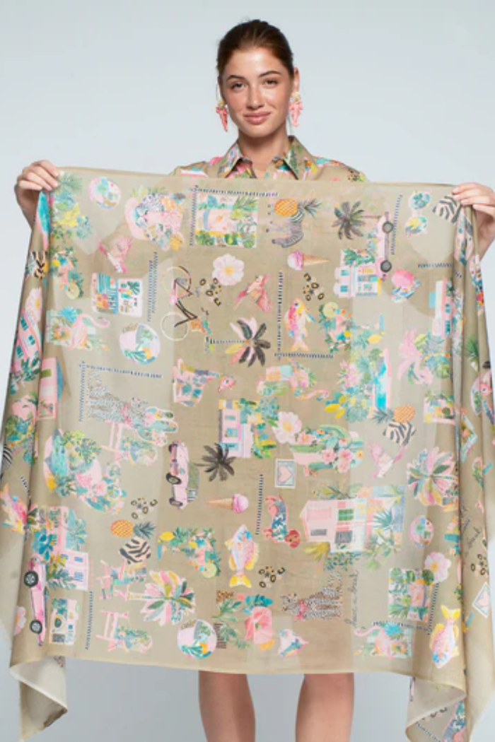 Rectangular scarf with California print on a tan background.