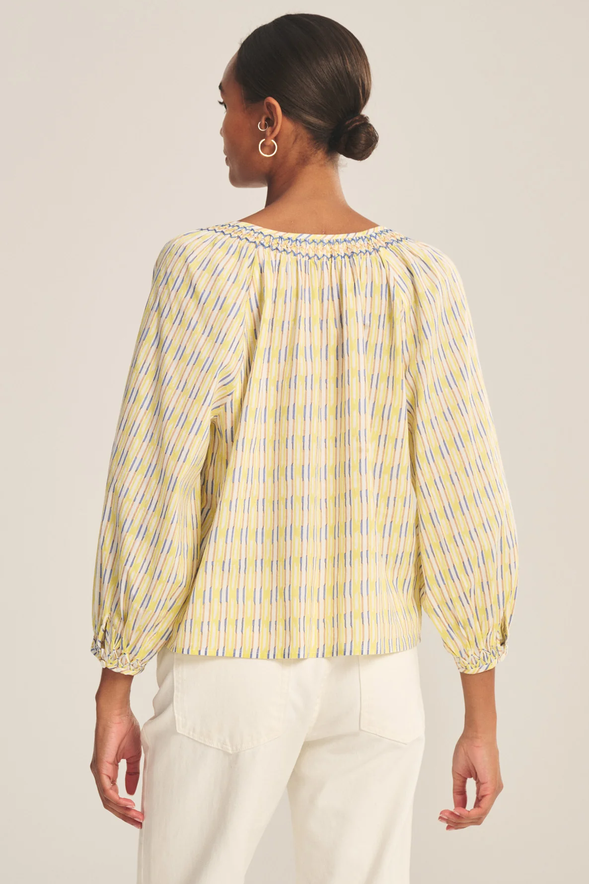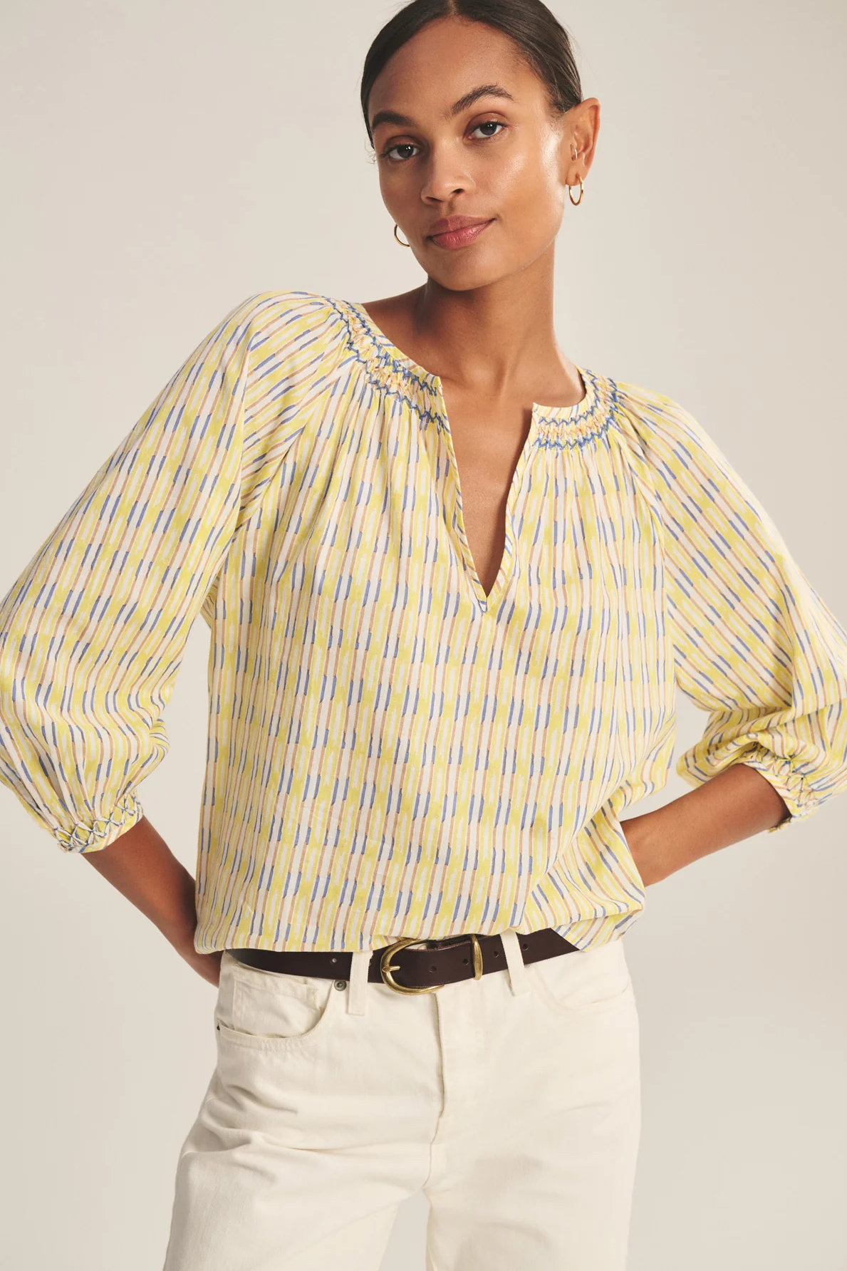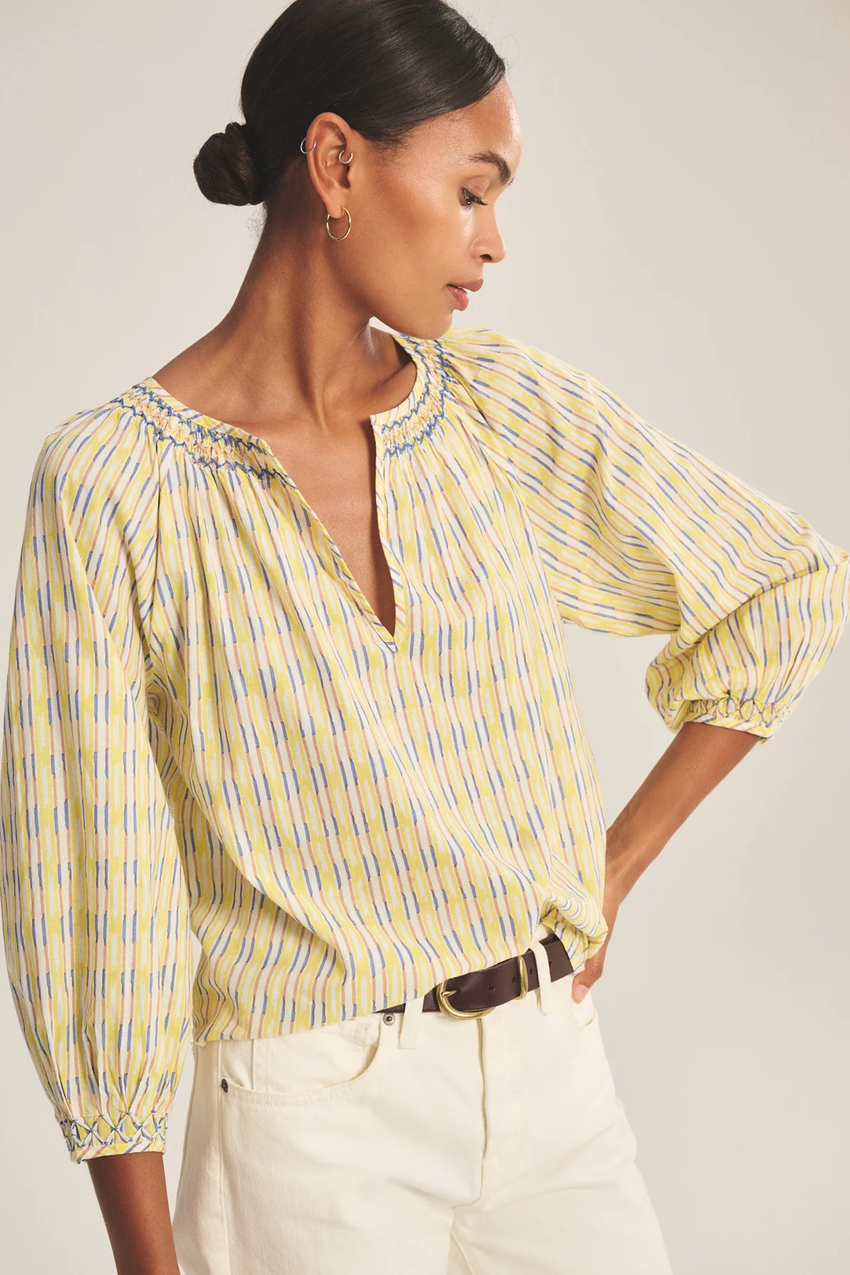 Crafted from light printed cotton stripe, this standout top features a V-neckline with crisscross stitch embroidery, decorative pleated detailing on the single-button cuffs, and a relaxed silhouette. Blending quality craftsmanship with effortless style, it's for casual days or elevated weekend outings.