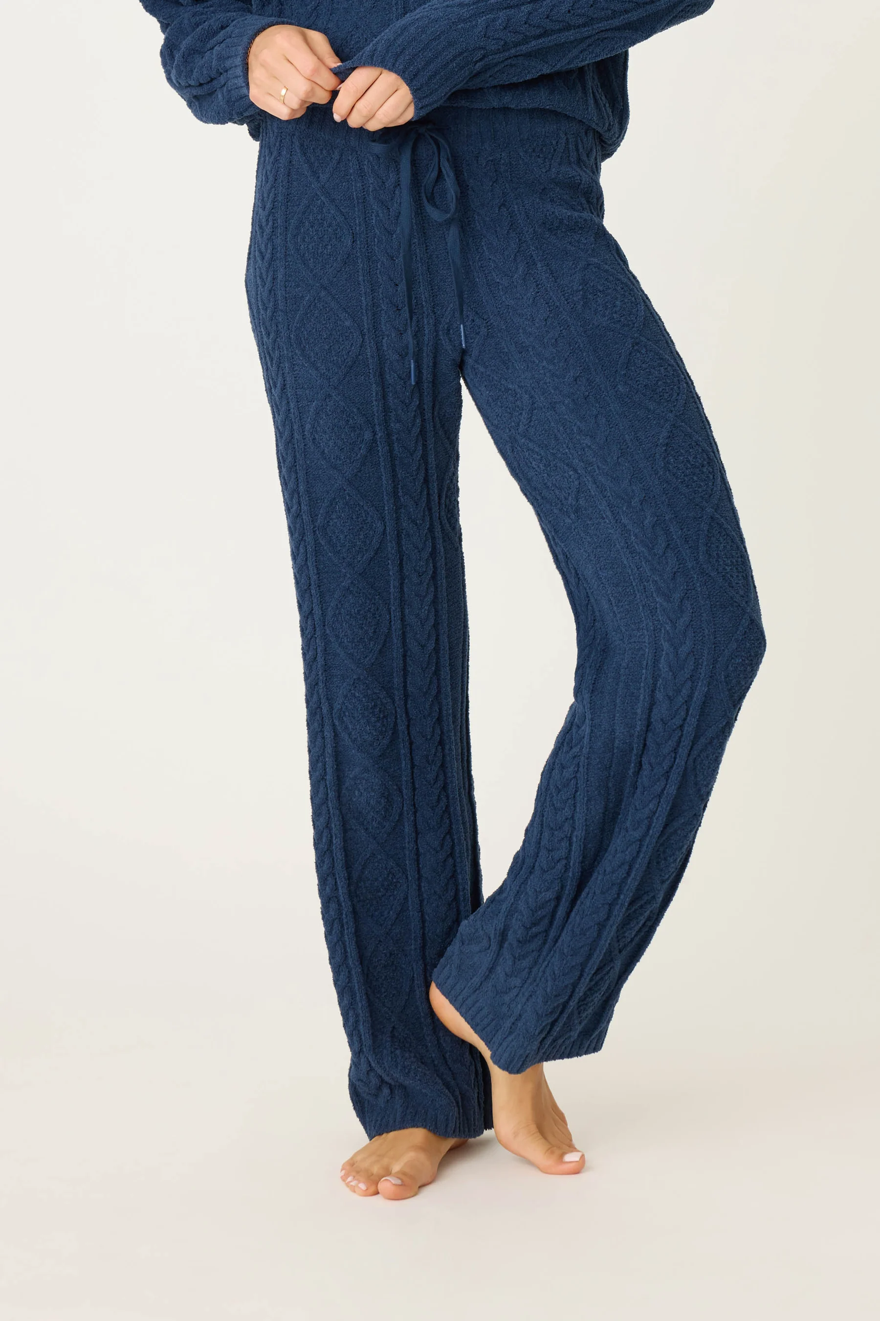 Elevate your downtime with richly hued navy cable knit lounge pants. Crafted from soft chenille cable knit the elegant cable knit pattern adds a touch of sophistication, making these pants perfect for both relaxing at home and casual outings. Complete the look with a matching top for a cozy seasonal look.